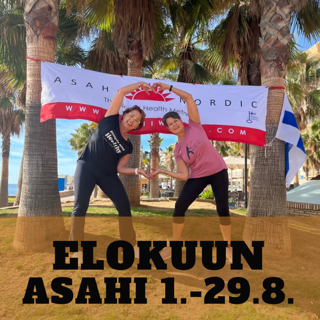 Asahi on suomalaista kehon ja mielen lempeää terveysliikuntaa, joka sopii kaikille iästä ja terveydentilasta riippumatta. Liikkeet tehdään seisten eikä mitään välineitä tarvita. Pulssi pysyy 80-120 välillä, joten se sopii myös sydänkuntoutujille sekä raskauden aikana.