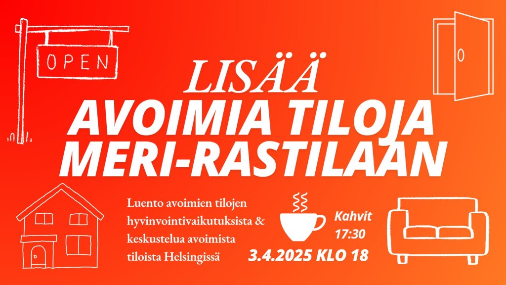 Luento-osuuden jälkeen keskustelemme avoimien tilojen tarpeesta Meri-Rastilassa ja laajemmin Helsingissä, ja miten kaupunki voisi edesauttaa asiaa. Kutsumme keskusteluun asukkaita, kuntavaaliehdokkaita, kaupungin edustajia sekä avoimia tiloja pyörittäviä tahoja. Keskustellaan kunnioittavassa hengessä ja antaen tilaa erilaisille näkemyksille.