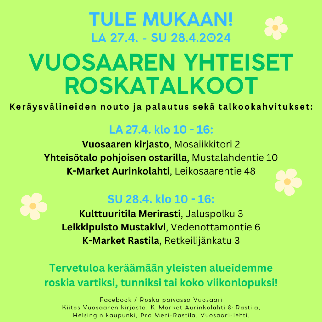 TERVETULOA Vuosaaren perinteiseen hyvän mielen kevättapahtumaan, kaikille avoimiin Vuosaaren alueen roskienkeruutalkoisiin.